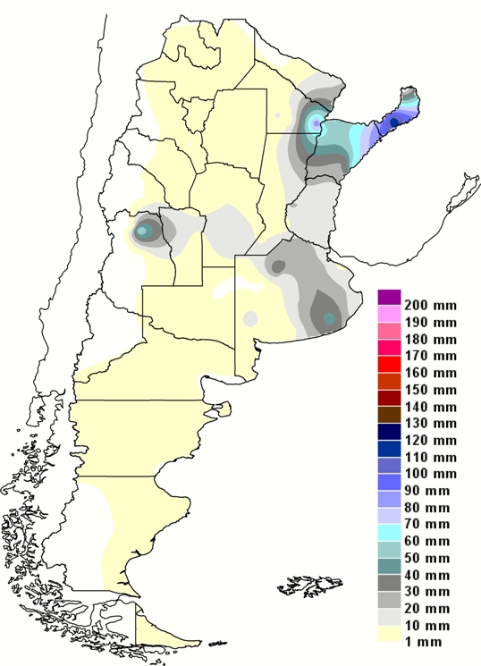 En la Patagonia y el noroeste hubo sólo lluvias débiles y aisladas. En Cuyo, hubo algunas precipitaciones el lunes y luego el sábado, registrando un máximo muy marcado en la localidad de San Martín, Mendoza, donde cayeron 64mm en un día, lo cual es atípico. En la región pampeana hubo algunas lluvias entre martes y miércoles, focalizadas en el este de la región. Viernes y sábado hubo nuevamente lluvias, pero solamente en el norte de Buenos Aires. El domingo las tormentas se dieron en todo Buenos Aires, sur de Córdoba y de Santa Fe, con mayores valores registrados en el sur y centro bonaerense. En el noreste y Litoral del país hubo lluvias de lunes a miércoles, con abundantes registros en el este de Chaco, Corrientes y Misiones.