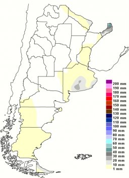 Luego de las intensas precipitaciones sobre el sur y sudeste bonaerenses de la semana anterior, entre lunes y martes siguieron las lluvias allí. En esos dos días se sumaron entre 10 y 30mm más en esa zona. En el resto de pampeana los montos acumulados de lluvias fueron inferiores a los 10mm. En el noreste del país sábado y domingo se registraron lluvias y tormentas. Sobre Misiones se acumularon entre 20 y 60mm, mientras que en Formosa fueron inferiores a los 10mm. En Patagonia, el noroeste de esta región tuvo algunas lluvias débiles este fin de semana.