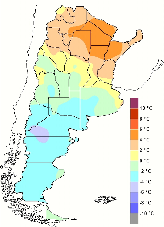Luego de las altas temperaturas de días pasados, una masa de aire algo más fría ocupó toda la Patagonia y hacia mitad de la semana quiso hacerlo en la franja central y el norte argentino. Lo logró recién hacia el viernes. A partir del viernes las temperaturas fueron mayormente por debajo de lo normal, dominó el mal tiempo y durante el fin de semana una enorme porción de Buenos Aires al sur del río Salado registró mínimas por debajo de los 5°C. En el norte antes de la llegada del aire fresco las máximas llegaron a 38/45°C, mientras que en el centro llegó a 34/38°C.