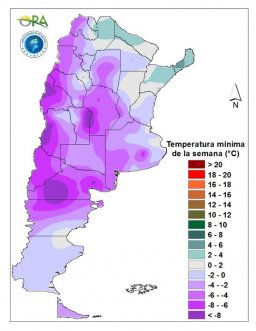 Las temperaturas en la zona cordillerana central van a estar sobre lo normal, mientras que la zona norte y este del país, tendrán temperaturas por debajo de lo normal durante la semana. Las temperaturas irán en aumento hasta el miércoles en la zona central y norte del país. Ese día, el ingreso de un sistema frontal desde Patagonia, hará descender las temperaturas desde el jueves hasta el domingo en la zona central y norte. Podrían darse condiciones de heladas agronómicas en toda la provincia de Buenos Aires, Córdoba, sur de Santa Fe y este de La Pampa.