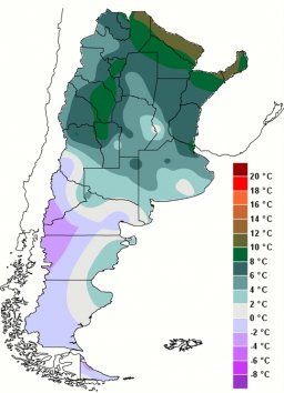 Las temperaturas fueron en franco ascenso en el norte desde el lunes hasta el jueves. A partir de ese día, las máximas se mantuvieron estables y las mínimas tuvieron un leve ascenso. Los valores oscilaron entre 22 y 28ºC de máxima, 10 y 15ºC de mínima. Hacia el centro este del país, pasó algo similar. Temperaturas en ascenso hasta el jueves, con mínimas de entre 6 y 12ºC, máximas de entre 22 y 26ºC, para luego de ese día descender nuevamente, a mínimas de 6ºC o menos en algunos lugares del sur de Buenos Aires, dándose algunas heladas. La semana, en resumen, tuvo registros apenas encima de lo normal para la época del año, excepto algunas regiones por debajo, debidas al mal tiempo. Lo notable es que aún no hubo ninguna irrupción de aire cálido importante sobre la región central del país. Los próximos días serán de temperaturas templadas a cálidas, con máximas entre 24 y 28ºC en el noreste, más altas en algunas zonas del norte, mínimas bajando hacia el fin de semana, con marcas entre los 14 y 18ºC. En la región pampeana, se espera, hasta el fin de semana, mínimas de entre 12 y 15ºC, máximas entre 22 y 26ºC. En ambas regiones se espera poca amplitud térmica durante miércoles y/o jueves, dadas las condiciones de mal tiempo imperantes en gran parte del país. Para el próximo fin de semana, luego de que mejore el tiempo en el centro y el norte, se darán temperaturas más bajas que en el resto de la semana, siendo más frías sobre el sudoeste y sur de Buenos Aires.