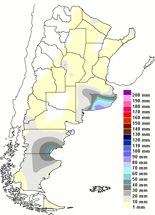 Como dijimos anteriormente, el régimen de lluvias de esta semana fue modulado por el pasaje de un frente frío entre miércoles y jueves y otro el domingo por la noche. La zona más beneficiada fue el sudeste y centro de Buenos Aires, por la suma de la actividad del frente de mitad de la semana anterior y el que afectó esa zona durante el fin de semana. En el resto, los acumulados fueron escasos, muchos puntuales y menores a 10mm. Otra zona que llama la atención es la de Comodoro Rivadavia, con más de 40 mm en lo que va de noviembre. El mismo frente que pasó el domingo sobre el este de la región pampeana activó hoy lunes zonas de lluvia en el centro y norte de Buenos Aires, dejará más agua en lo que queda del lunes sobre el sur del litoral, norte de Buenos Aires, sur de Santa Fe y Córdoba. El martes la zona de lluvias se desplaza al norte, cubriendo con algunas tormentas al este de Formosa, Chaco y todo el territorio de Misiones y Corrientes. Luego, predominará el buen tiempo sobre todo el país hasta el fin de semana por lo menos.