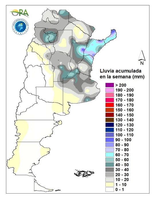 Durante la semana no se prevén grandes acumulados de precipitación en ninguna región del país. Desde el miércoles y hasta el sábado se esperan eventos aislados en zonas cordilleranas de Patagonia, así como también en varias zonas del NOA, donde se podría dar persistencia de lluvias durante el período mencionado. Entre domingo y martes próximo, podrían darse algunas precipitaciones aisladas en el sur de Buenos Aires, este de La Pampa, zonas del NOA y NEA y también en las zonas cordilleranas de Patagonia.