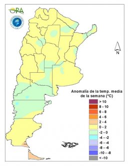 Se prevén temperaturas medias debajo de lo normal a normal en casi todo el país. Entre lunes y jueves, se mantendrán bajas temperaturas, principalmente en la zona centro y norte. Durante este periodo se podrían dar condiciones para heladas y heladas agronómicas en zonas de Buenos Aires, La Pampa, San Luis, Mendoza, Córdoba, Santa Fe, Entre Ríos e incluso algunas zonas del NOA y NEA. A partir del viernes y hasta el domingo, se espera que las temperaturas tengan algunos aumentos, principalmente en las temperaturas máximas.