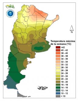 Se prevén temperaturas medias normales a levemente debajo de lo normal en la mayor parte del país. Entre lunes y martes se mantendrán temperaturas bajas con posibilidad de heladas agronómicas y meteorológicas en zonas de La Pampa, centro y sur de Córdoba, San Luis y sur de Santa Fe. Luego entre miércoles y viernes, se espera que las temperaturas en la zona central y norte tengan un leve aumento. En el sur, durante este mismo periodo, se darán algunas intrusiones de aire frío que mantendrán las temperaturas bajas. Entre viernes y sábado se espera un ingreso de aire frío que hará descender las temperaturas desde el sur hasta el norte del país.