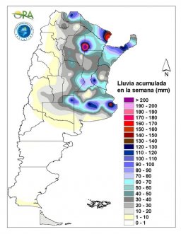 En el mapa de lluvia acumulada en la semana se destacan los altos valores del sudoeste de Chaco, como por ejemplo 332mm en la localidad de Gancedo, que se acumularon entre los días 26 y 27. Por primera vez en meses, se reportaron acumulados semanales superiores a 100mm desde diferentes áreas del país: Formosa 180mm, Posadas 132mm, Tartagal 123mm, Victoria (Entre Ríos) 136mm, Gral. Pico 126mm, Bolívar (Bs. As.) 132mm, Azul 118mm, Olavarría 110mm. En la zona núcleo los montos registrados fueron muy dispares.