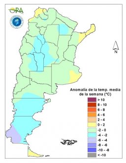 Se prevén temperaturas normales a inferiores a lo normal en Patagonia y algunos sectores del centro sur de Argentina, mientras que el centro norte y norte del país, se esperan temperaturas normales a sobre lo normal. Entre lunes y miércoles los efectos de un sistema frontal que avanza en la zona central mantendrán temperaturas bajas con posibilidad de heladas agronómicas y meteorológicas en Patagonia, Buenos Aires, La Pampa, Mendoza, San Luis, centro y sur de Córdoba y Santa Fe, sur de Entre Ríos. Entre jueves y domingo se espera que las temperaturas aumenten, principalmente en el norte (NEA), pero también en sectores del centro del país. Igualmente el avance de un sistema frontal en Patagonia afectará dicha zona y sectores del centro-sur donde podrían darse heladas agronómicas en el mismo periodo.