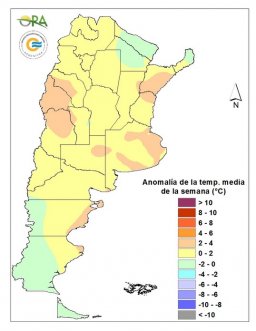 Se esperan temperaturas medias normales a sobre lo normal en la mayor parte del país. Entre lunes y domingo la zona norte y centro del país mantendrán y verán aumentadas las temperaturas cálidas, debido a una zona de alta presión en el Atlántico que permanecerá en el NEA, favoreciendo la intrusión de aire cálido. Con ello varias localidades de dichas zonas registrarían máximas sobre 35oC y también, durante viernes y sábado, podría haber algunas áreas al noroeste de Córdoba y sudeste de Santiago del Estero con posibilidad de máximas sobre 40oC. Para la Patagonia se distinguen dos sectores, por un lado el norte, con altas temperaturas, y por el otro el centro y el sur, más frío, con algunos pasajes de sistemas frontales.