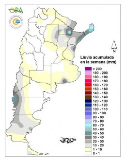 No se esperan grandes acumulados en la semana. Entre martes y jueves se esperan lluvias en el este de Formosa y Chaco, Corrientes y Misiones, además de eventos de lluvia y nieve en Tierra del Fuego y Santa Cruz. Entre viernes y sábado se esperan precipitaciones en Corrientes, Misiones y algunos sectores del este de Formosa y Chaco.