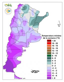 En la semana se esperan temperaturas medias normales a sobre lo normal en el centro y norte del país y normales a por debajo de lo normal en el sur. Entre lunes y jueves se prevé que se mantengan temperaturas frías en todo el país, con posibilidad de heladas agronómicas y meteorológicas en Corrientes, Chaco, Santa Fe, Entre Ríos, Córdoba, Mendoza, San Juan, NOA, San Luis, La Pampa, Buenos Aires y Patagonia. A partir del viernes y hasta el lunes próximo se espera que las temperaturas tengan un rápido ascenso en el centro y principalmente en el norte, con posibilidad de máximas sobre 35°C en el norte de Santiago del Estero, Chaco y Formosa.
