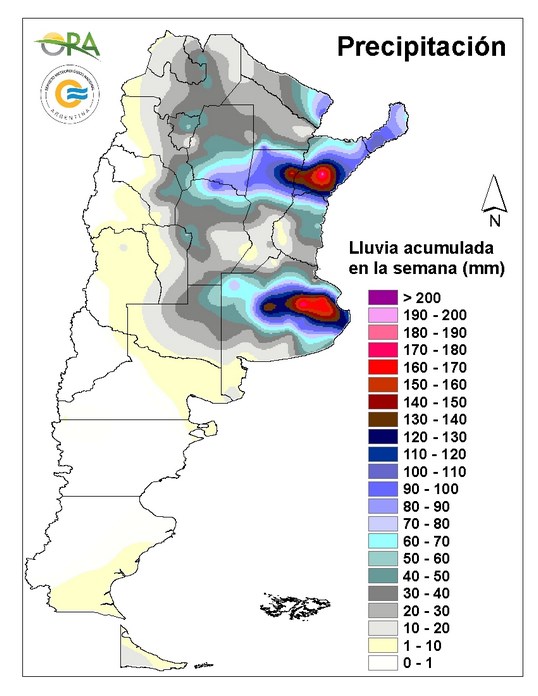 Se observan en el mapa dos núcleos con lluvias acumuladas superiores a 100mm. El de más al norte incluye los reportes: Mercedes (Corrientes) 185mm, Reconquista 154mm, Monte Caseros 135mm, Paso de los Libres 112mm. El de más al sur incluye los siguientes registros: Las Flores 181mm, Dolores 163mm, Bolívar 142mm, Villa Gesell 122mm, 9 de Julio 101mm. También en Villa María del Río Seco, en el norte de Córdoba, se registraron 102mm en la semana.