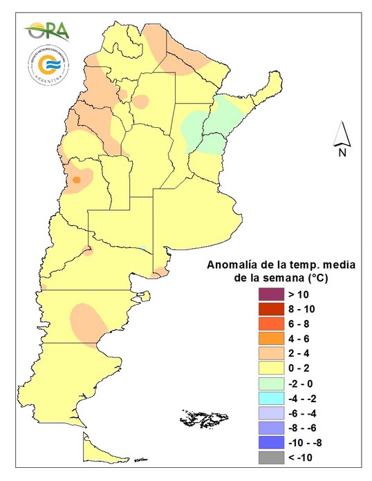 En la semana se esperan temperaturas medias normales a levemente bajo lo normal en el centro y sur, mientras que en el norte se esperan temperaturas normales a sobre lo normal para esta época. Entre martes y jueves, con el avance de un sistema de baja presión, se espera que las temperaturas en Patagonia y centro-sur del país tengan leves descensos. Durante este periodo podría haber localidades del NOA y NEA con posibilidad de máximas sobre 35°C. A partir del viernes y hasta el lunes de la próxima semana se esperan temperaturas en ascenso en todo el país. En este periodo podrían darse máximas sobre 35°C en algunos sectores del norte de Patagonia y sur de La Pampa y extremo sudoeste de Buenos Aires, además de sectores del NOA.