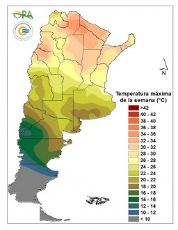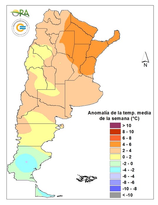 La semana fue muy fría en Patagonia, con un mínimo de -12°C en Gobernador Gregores. Se registraron heladas también en áreas cordilleranas del centro y sur y gran parte del centro del país. Las máximas resultaron menores que 5°C en el sur de Patagonia. En el otro extremo, se dieron máximas superiores a 30°C en el norte del país. La temperatura media de la semana resultó significativamente superior a la normal desde zona núcleo hacia el norte del país.