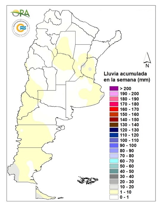 Pocas estaciones reportaron lluvias semanales que llegaron a sumar 15mm o más: Paraná (22mm), Rosario del Tala (15mm), El Calafate (15mm) y Ushuaia (18mm).