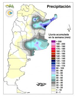 Se registraron acumulados semanales superiores a 100mm en localidades del NEA. Los mayores valores reportados son: 133mm en Monte Caseros (Corrientes), 117mm en Posadas (Misiones) y 110mm en Gancedo (Chaco).