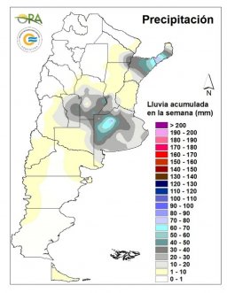 El resto de estaciones de San Luis, centro y sur de Córdoba y sur de Santa Fe tuvieron registros entre 20mm y 40mm durante la semana. En el NEA se destaca el acumulado en Posadas (73mm) y Resistencia (38mm).