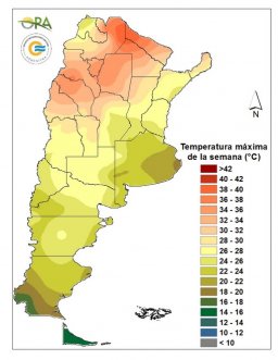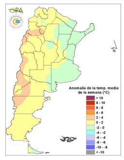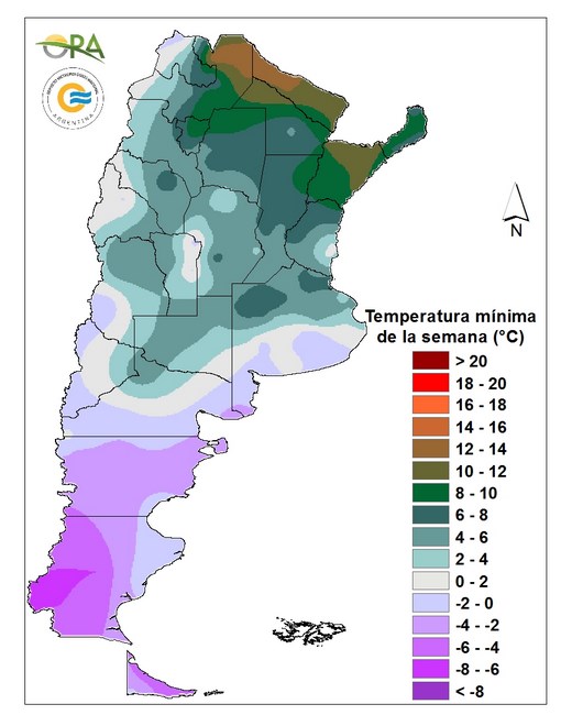 La temperatura media de la semana se encuentra en rangos normales. Durante el periodo de monitoreo se registraron heladas en Patagonia, sectores del sur de Cuyo, en Buenos Aires, oeste del NOA, sectores serranos de San Luis y Córdoba.