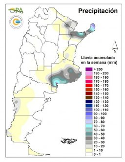 También se registraron más de 50mm en la semana en localidades de la provincia de Buenos Aires: 74mm en Bahía Blanca, 53mm en Tres Arroyos, 52mm en Las Flores.
