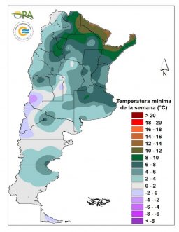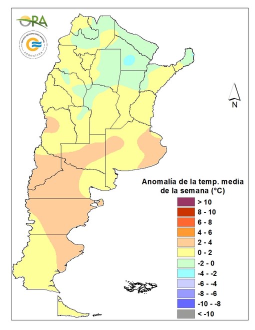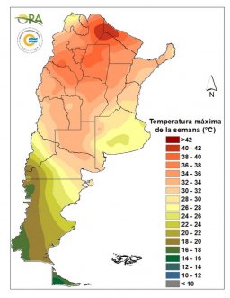 La temperatura media de la semana resultó normal, aunque se registraron extremos térmicos. Se reportaron máximas de más de 40°C en el extremo norte del país, con un registro máximo de 42°C en Rivadavia (Salta).