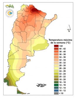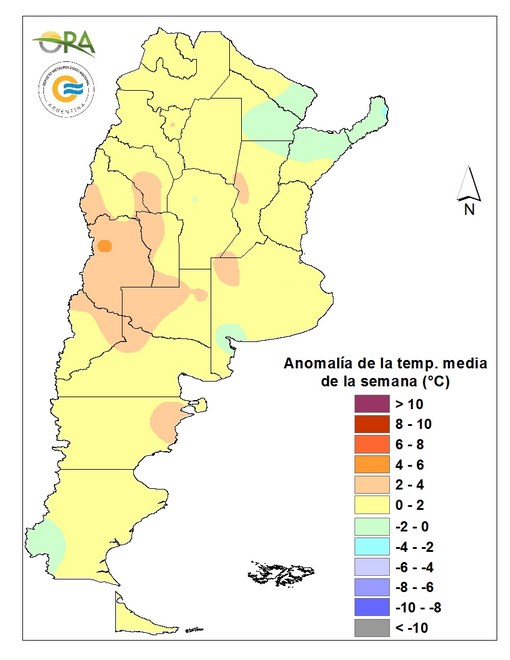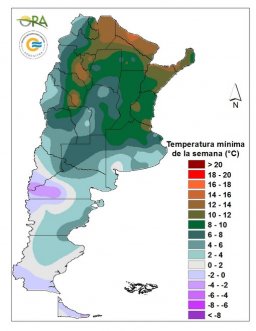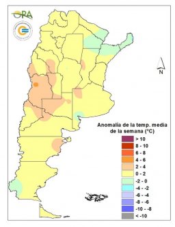 La temperatura media de la semana resultó normal en prácticamente todo el territorio nacional. Solo se registraron heladas en sectores de Patagonia, con un mínimo de -3.8°C en Maquinchao (Río Negro).