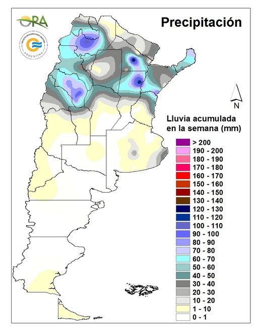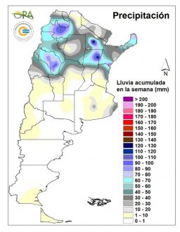 Se registraron más de 100mm acumulados en estaciones del norte del país: 137 mm en Sáenz Peña (Chaco), 125mm en Reconquista (Santa Fe), 111mm en Salta capital, 102mm en Chamical (La Rioja). La red de la BCER reporta acumulados de más de 100mm en estaciones del noreste de Entre Ríos.