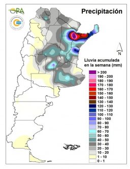 Lluvias muy intensas se registraron en estaciones del NEA: 233mm en Resistencia (Chaco), 184mm en Ituzaingó (Corrientes) y 166mm en Corrientes capital. También hubo acumulados de 132mm en Concordia (Entre Ríos) y 123mm en Posadas (Misiones).