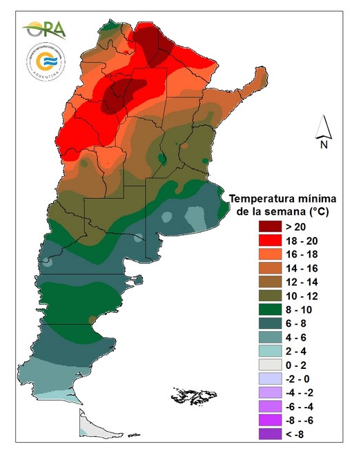 Con el cambio de masa de aire, las mínimas descendieron notablemente, sin heladas. Solo se registraron 0°C en Río Grande (Tierra del Fuego).