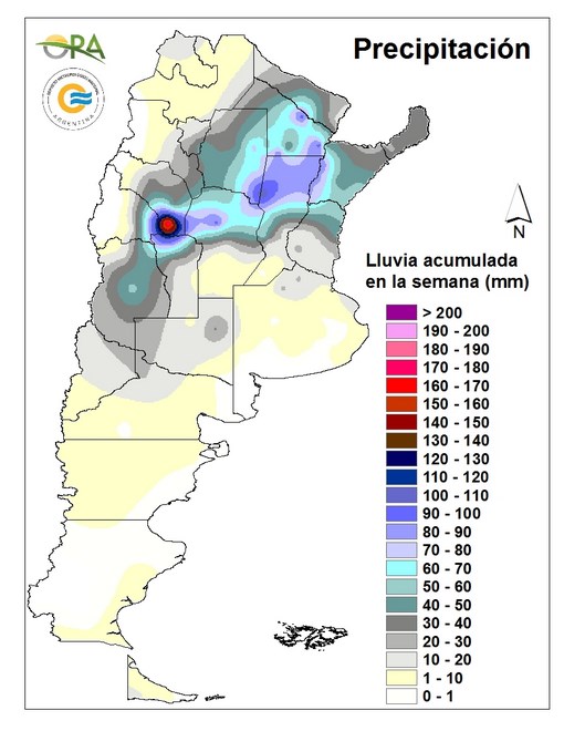 Sólo 2 estaciones reportaron precipitaciones sobre los 100mm: Chepes (179mm) en La Rioja y Ceres (108mm) en Santa Fe. Si bien estuvieron dispersas, la mayor parte se concentró en el NOA, NEA y centro-norte del país, donde se destacan los registros de Resistencia (93mm), Santa Sylvina (85mm) en Chaco, Córdoba (93mm), Reconquista (81mm) en Santa Fe, Santiago del Estero (41mm) y Malargüe (26mm) en Mendoza.