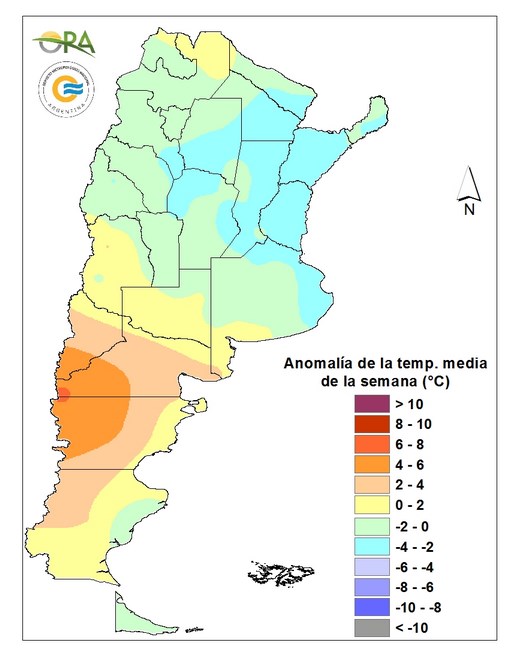 Las anomalías en oeste de Patagonia fueron más cálidas que lo normal, acompañando la situación de incendios forestales en la zona. Se destacaron los registros de 38°C en Neuquén, El Bolsón y Río Colorado.