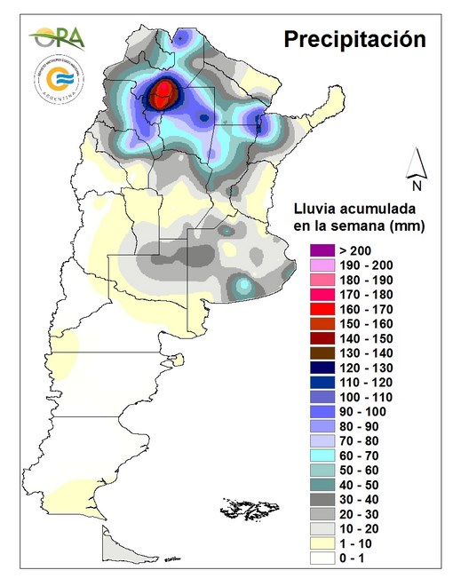 Las lluvias más importantes ocurrieron en el NOA y NEA. Se destacan los registros con más de 90mm en Metán, y Tartagal en Salta, Tucumán, Resistencia en Chaco, Corrientes, Catamarca y Ceres en el norte de Santa Fe.