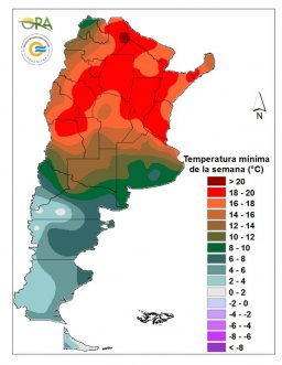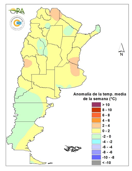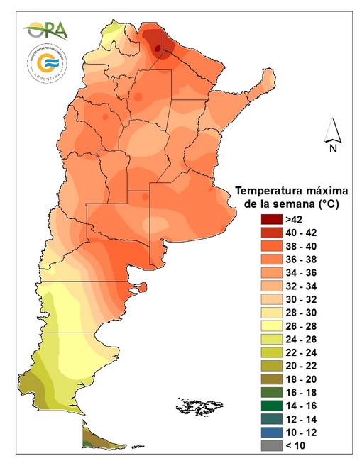 Las temperaturas de la semana fueron normales para la época. Se destaca la zona con máximas sobre 35°C que abarcan desde el norte de Patagonia hasta el NOA.