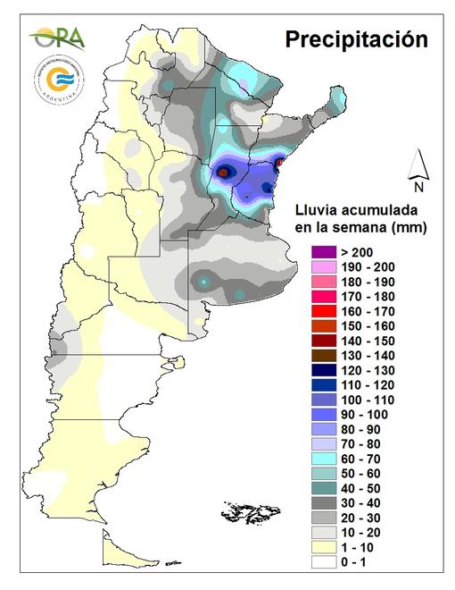 Los mayores acumulados del periodo (09/02 al 17/02) se registraron en el centro de Santa Fe, sur de Corrientes y norte de Entre Ríos. Algunos registros de esta zona son: 165mm en Monte Caseros (Corrientes), 156mm en Sunchales (Santa Fe) y 126mm en Colón (Entre Ríos). En el sur de Buenos Aires se reportaron más de 20mm, con un máximo de 55mm en Pigüé. También se registraron 34mm en Coronel Suárez, Benito Juárez y Mar del Plata.
