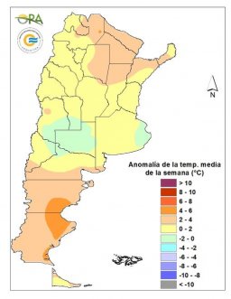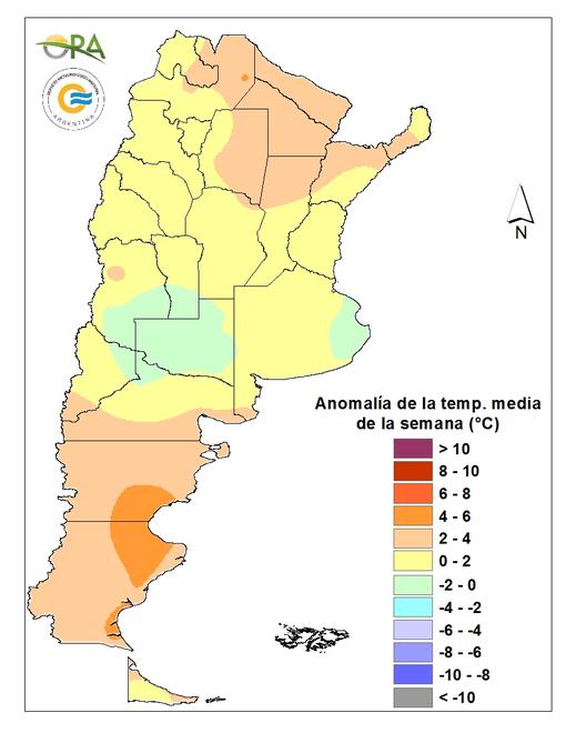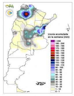 En Metán (Salta) se acumularon 206mm en la semana, la mayor parte reportados el miércoles 5. No se recibieron otros reportes superiores a 100mm semanales. Las mayores precipitaciones se registraron en Villa María del Río Seco (80mm),Santa Rosa de Conlara (77mm) y Orán (67mm). En la zona núcleo el máximo reportado fue de 52mm en Pergamino (BCR). En la mayor parte de la provincia pampeana el acumulado semanal fue de menos de 20mm.