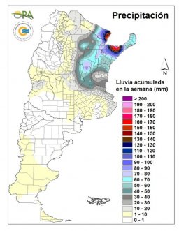 En la semana se reportaron más de 100mm acumulados en estaciones del NEA: 202mm en Ituzaingó, 161mm en Formosa y 116mm en Posadas. En el mapa se ve un máximo secundario en Santa Fe, que corresponde a reportes de 83mm en Sunchales y 79mm en Rafaela.