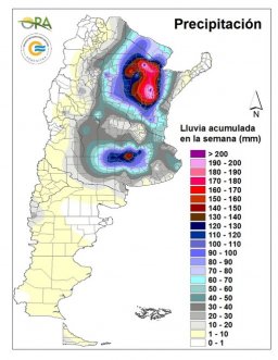 También se destacan los acumulados en Pehuajo (155mm), Trenque Lauquén (128mm), 9 de Julio (125mm) en Buenos Aires y Gral Pico (119mm) y Santa Rosa (100mm) en La Pampa.