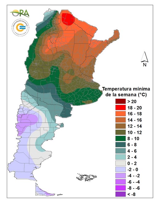 En cuanto a las mínimas, hubo heladas leves en el oeste y sur de Patagonia, con un mínimo reportado de -3.8°C en Maquinchao (Río Negro).