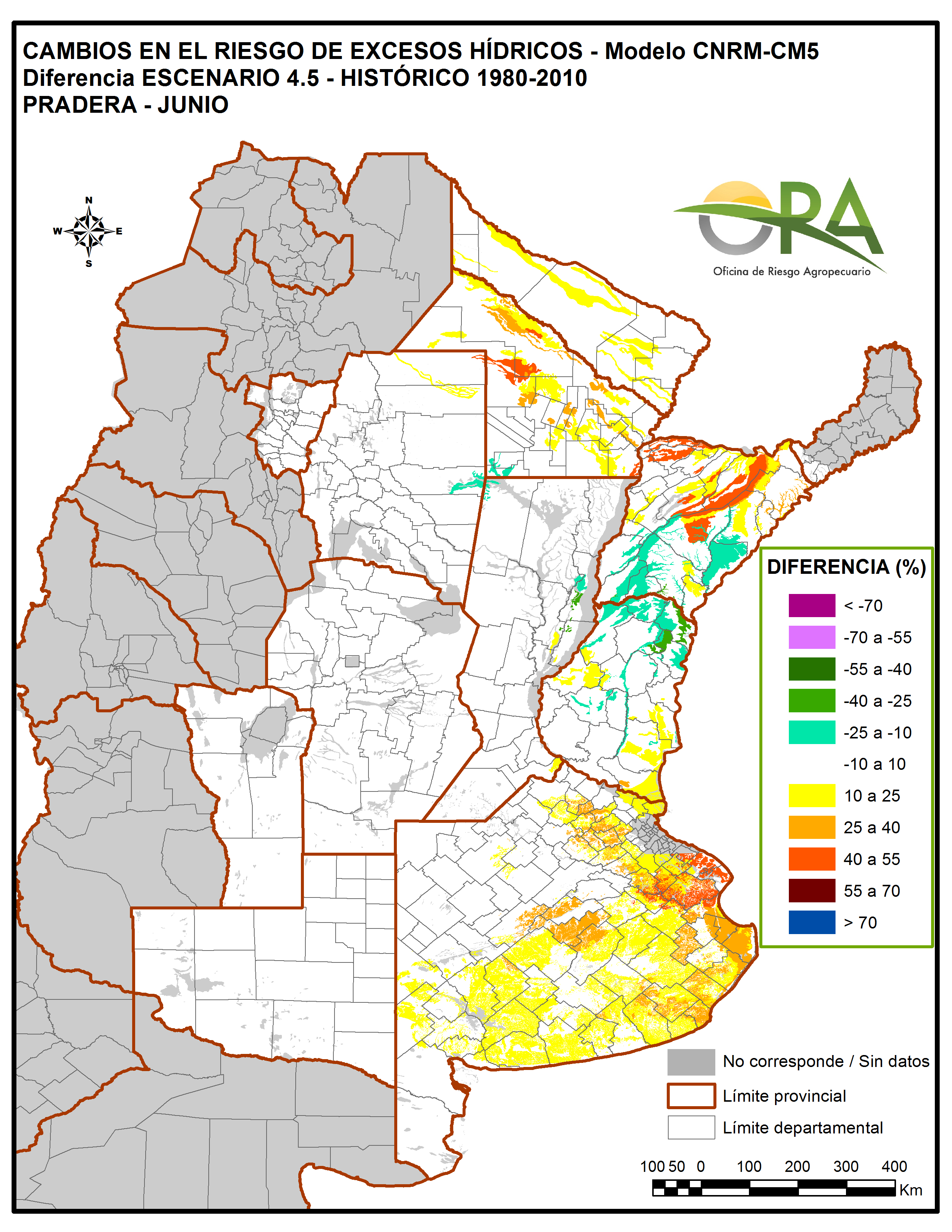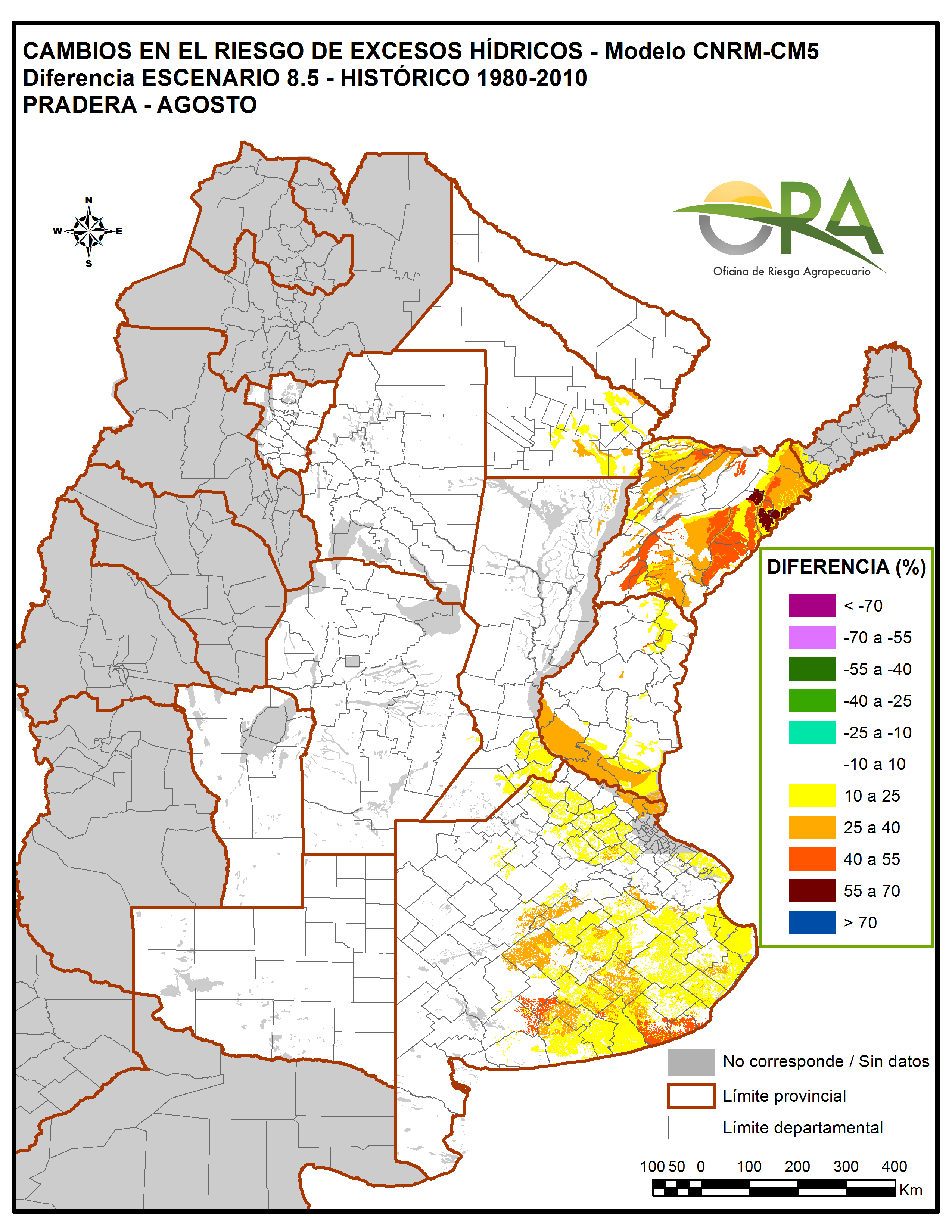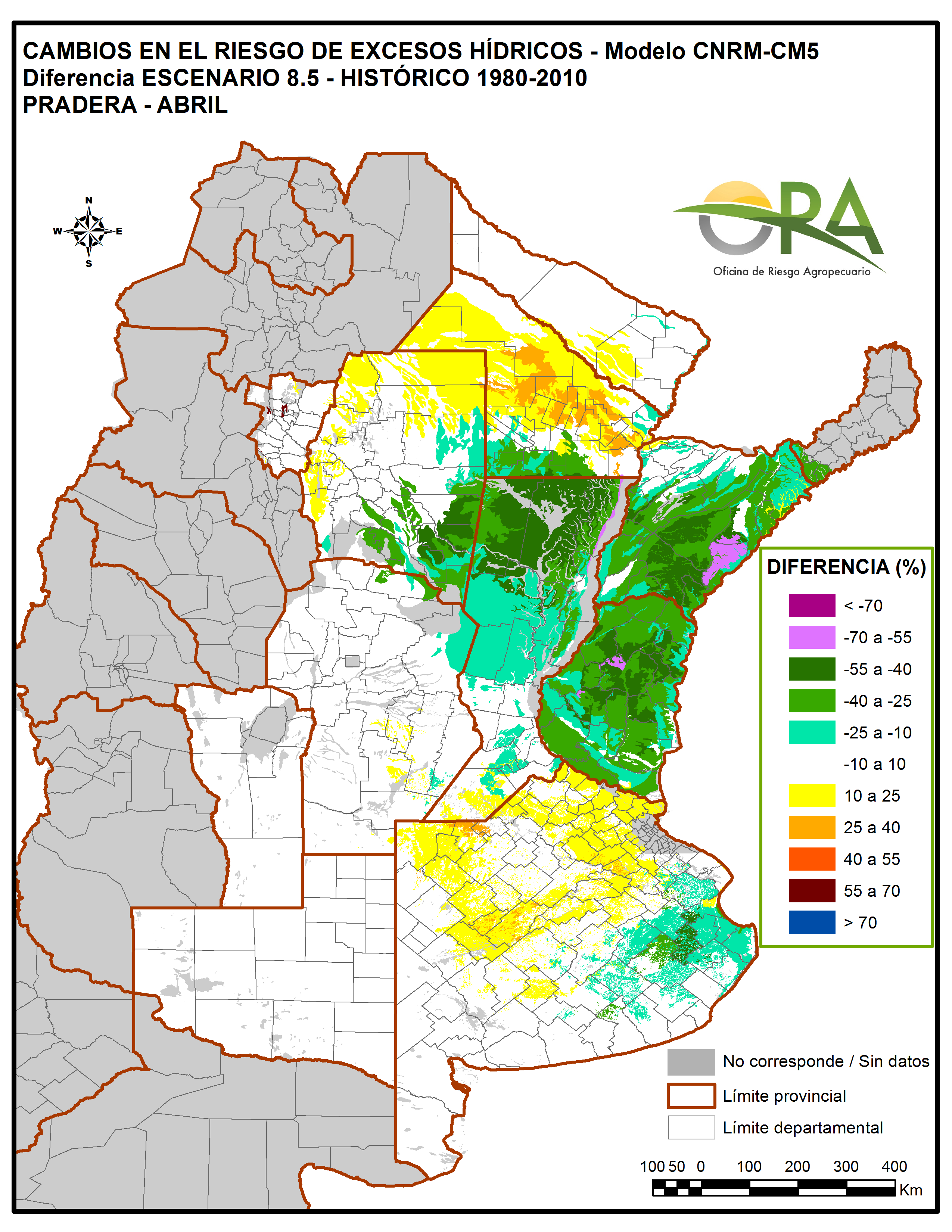 Para analizar los cambios a futuro se mapearon las diferencias entre los resultados obtenidos (probabilidad de déficit o de excesos) para los escenarios y para la serie histórica.